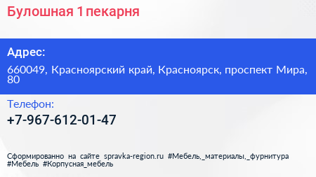 Булошная №1, пекарня по адресу 660049, Красноярский край, Красноярск, проспект Мира, 80 в дальнейшем Организация, размещена в следующих категориях: