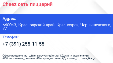 Cheez, сеть пиццерий по адресу 660043, Красноярский край, Красноярск, Чернышевского, 77 в дальнейшем Организация, размещена в следующих категориях: