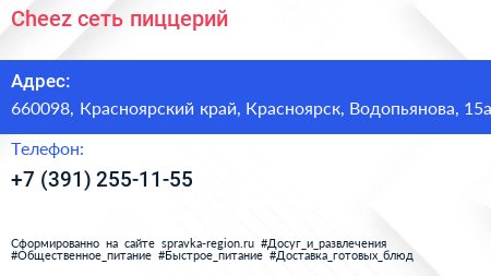 Cheez, сеть пиццерий по адресу 660098, Красноярский край, Красноярск, Водопьянова, 15а в дальнейшем Организация, размещена в следующих категориях: