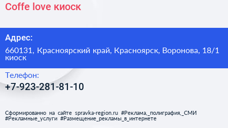 Coffe love, киоск по адресу 660131, Красноярский край, Красноярск, Воронова, 18/1 киоск в дальнейшем Организация, размещена в следующих категориях: