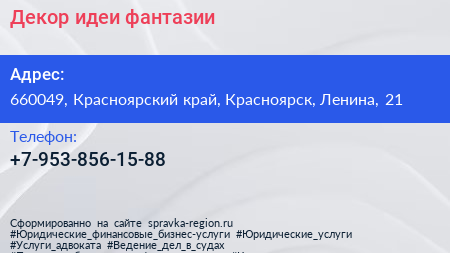 Декор: идеи+фантазии по адресу 660049, Красноярский край, Красноярск, Ленина, 21 в дальнейшем Организация, размещена в следующих категориях: