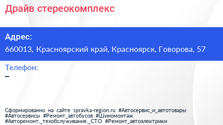 Драйв, стереокомплекс по адресу 660013, Красноярский край, Красноярск, Говорова, 57 в дальнейшем Организация, размещена в следующих категориях: