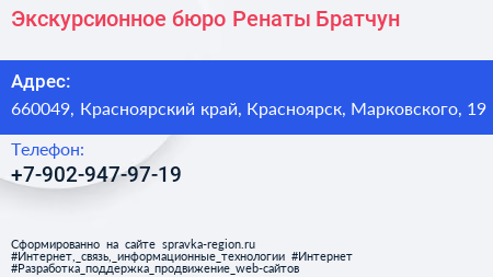 Экскурсионное бюро Ренаты Братчун по адресу 660049, Красноярский край, Красноярск, Марковского, 19 в дальнейшем Организация, размещена в следующих категориях: