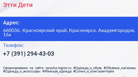 Этти Дети по адресу 660036, Красноярский край, Красноярск, Академгородок, 16а в дальнейшем Организация, размещена в следующих категориях: