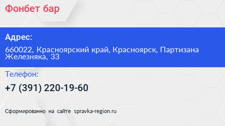 Фонбет, бар по адресу 660022, Красноярский край, Красноярск, Партизана Железняка, 33 в дальнейшем Организация, размещена в следующих категориях: