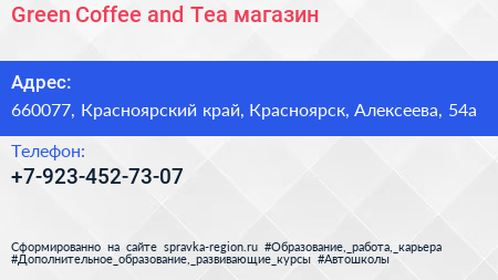 Green Coffee and Tea, магазин по адресу 660077, Красноярский край, Красноярск, Алексеева, 54а в дальнейшем Организация, размещена в следующих категориях: