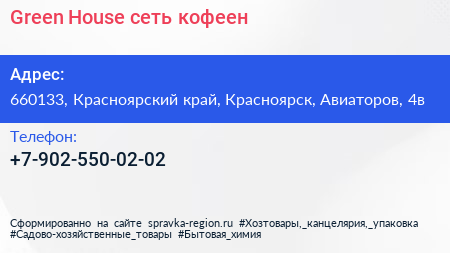 Green House, сеть кофеен по адресу 660133, Красноярский край, Красноярск, Авиаторов, 4в в дальнейшем Организация, размещена в следующих категориях: