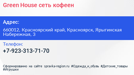 Green House, сеть кофеен по адресу 660012, Красноярский край, Красноярск, Ярыгинская Набережная, 3 в дальнейшем Организация, размещена в следующих категориях: