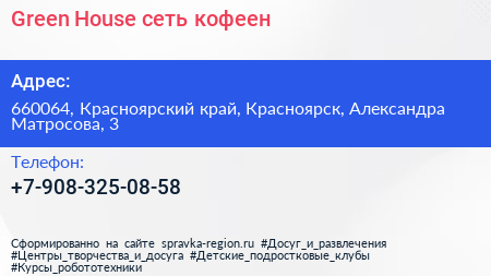 Green House, сеть кофеен по адресу 660064, Красноярский край, Красноярск, Александра Матросова, 3 в дальнейшем Организация, размещена в следующих категориях:
