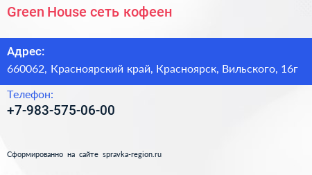 Green House, сеть кофеен по адресу 660062, Красноярский край, Красноярск, Вильского, 16г в дальнейшем Организация, размещена в следующих категориях: