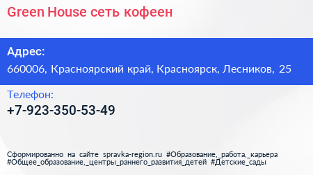 Green House, сеть кофеен по адресу 660006, Красноярский край, Красноярск, Лесников, 25 в дальнейшем Организация, размещена в следующих категориях: