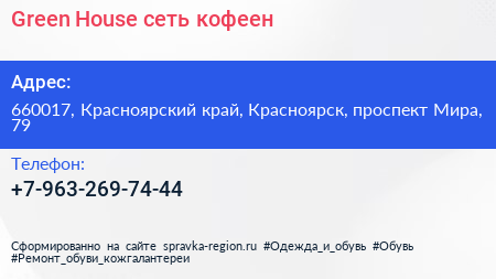 Green House, сеть кофеен по адресу 660017, Красноярский край, Красноярск, проспект Мира, 79 в дальнейшем Организация, размещена в следующих категориях: