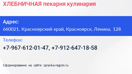ХЛЕБНИЧНАЯ, пекарня-кулинария по адресу 660021, Красноярский край, Красноярск, Ленина, 128 в дальнейшем Организация, размещена в следующих категориях: