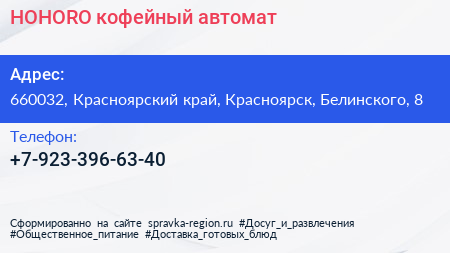 HOHORO, кофейный автомат по адресу 660032, Красноярский край, Красноярск, Белинского, 8 в дальнейшем Организация, размещена в следующих категориях: