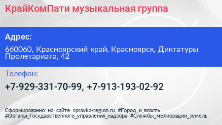 КрайКомПати, музыкальная группа по адресу 660060, Красноярский край, Красноярск, Диктатуры Пролетариата, 42 в дальнейшем Организация, размещена в следующих категориях:
