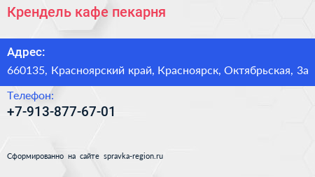 Крендель, кафе-пекарня по адресу 660135, Красноярский край, Красноярск, Октябрьская, 3а в дальнейшем Организация, размещена в следующих категориях: