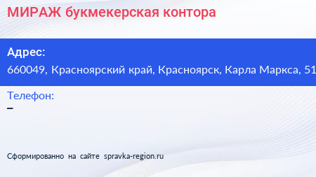 МИРАЖ, букмекерская контора по адресу 660049, Красноярский край, Красноярск, Карла Маркса, 51 в дальнейшем Организация, размещена в следующих категориях: