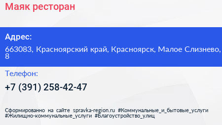 Маяк, ресторан по адресу 663083, Красноярский край, Красноярск, Малое Слизнево, 8 в дальнейшем Организация, размещена в следующих категориях: