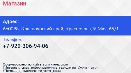 Магазин по адресу 660098, Красноярский край, Красноярск, 9 Мая, 65/1 в дальнейшем Организация, размещена в следующих категориях: