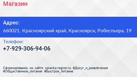 Магазин по адресу 660021, Красноярский край, Красноярск, Робеспьера, 19 в дальнейшем Организация, размещена в следующих категориях: