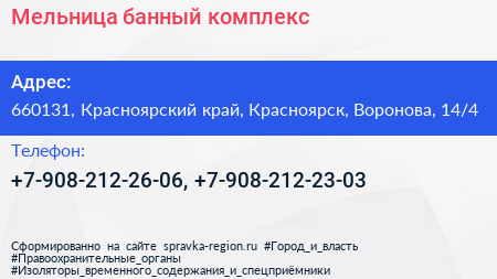 Мельница, банный комплекс по адресу 660131, Красноярский край, Красноярск, Воронова, 14/4 в дальнейшем Организация, размещена в следующих категориях: