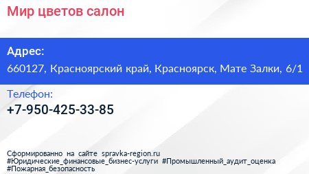 Мир цветов, салон по адресу 660127, Красноярский край, Красноярск, Мате Залки, 6/1 в дальнейшем Организация, размещена в следующих категориях: