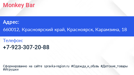 Monkey Bar по адресу 660012, Красноярский край, Красноярск, Карамзина, 18 в дальнейшем Организация, размещена в следующих категориях: