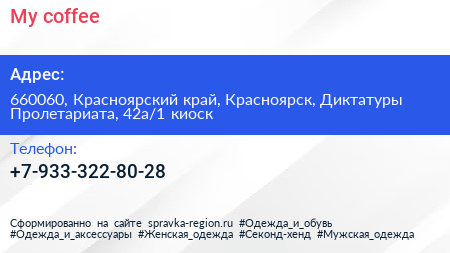 My coffee по адресу 660060, Красноярский край, Красноярск, Диктатуры Пролетариата, 42а/1 киоск в дальнейшем Организация, размещена в следующих категориях: