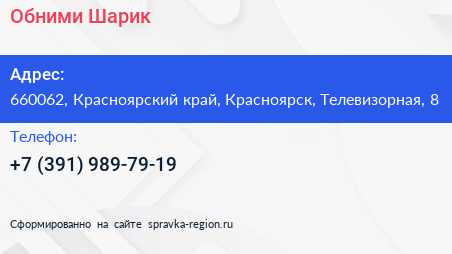 Обними Шарик по адресу 660062, Красноярский край, Красноярск, Телевизорная, 8 в дальнейшем Организация, размещена в следующих категориях: