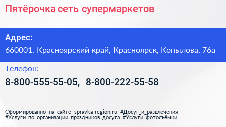 Пятёрочка, сеть супермаркетов по адресу 660001, Красноярский край, Красноярск, Копылова, 76а в дальнейшем Организация, размещена в следующих категориях: