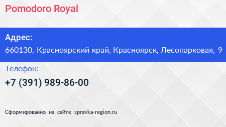 Pomodoro Royal по адресу 660130, Красноярский край, Красноярск, Лесопарковая, 9 в дальнейшем Организация, размещена в следующих категориях: