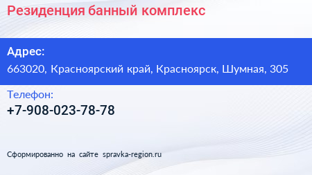 Резиденция, банный комплекс по адресу 663020, Красноярский край, Красноярск, Шумная, 305 в дальнейшем Организация, размещена в следующих категориях: