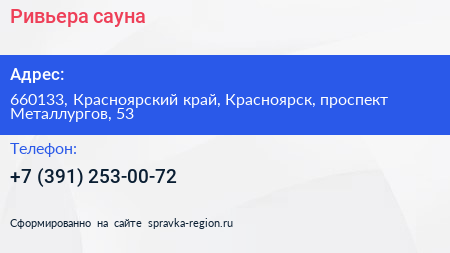 Ривьера, сауна по адресу 660133, Красноярский край, Красноярск, проспект Металлургов, 53 в дальнейшем Организация, размещена в следующих категориях: