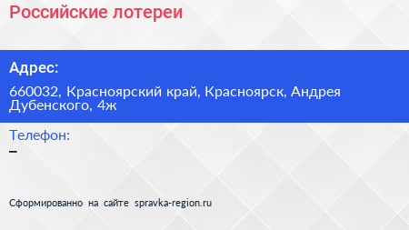 Российские лотереи по адресу 660032, Красноярский край, Красноярск, Андрея Дубенского, 4ж в дальнейшем Организация, размещена в следующих категориях: