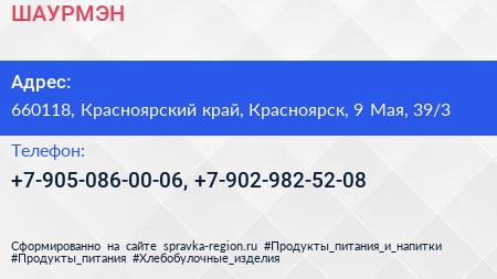 ШАУРМЭН по адресу 660118, Красноярский край, Красноярск, 9 Мая, 39/3 в дальнейшем Организация, размещена в следующих категориях: