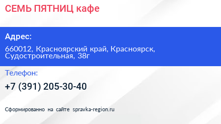 СЕМЬ ПЯТНИЦ, кафе по адресу 660012, Красноярский край, Красноярск, Судостроительная, 38г в дальнейшем Организация, размещена в следующих категориях:
