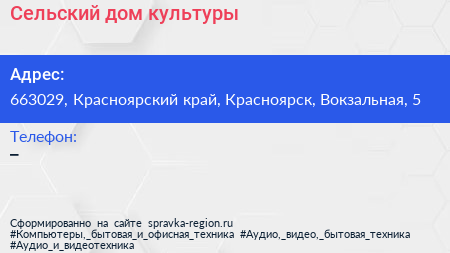 Сельский дом культуры по адресу 663029, Красноярский край, Красноярск, Вокзальная, 5 в дальнейшем Организация, размещена в следующих категориях:
