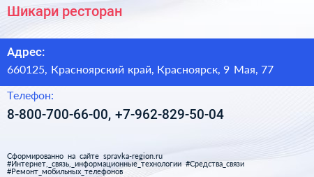 Шикари, ресторан по адресу 660125, Красноярский край, Красноярск, 9 Мая, 77 в дальнейшем Организация, размещена в следующих категориях: