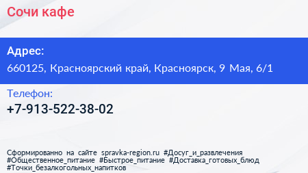 Сочи, кафе по адресу 660125, Красноярский край, Красноярск, 9 Мая, 6/1 в дальнейшем Организация, размещена в следующих категориях: