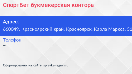СпортБет, букмекерская контора по адресу 660049, Красноярский край, Красноярск, Карла Маркса, 51 в дальнейшем Организация, размещена в следующих категориях: