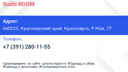 Sushi ROOM по адресу 660125, Красноярский край, Красноярск, 9 Мая, 77 в дальнейшем Организация, размещена в следующих категориях: