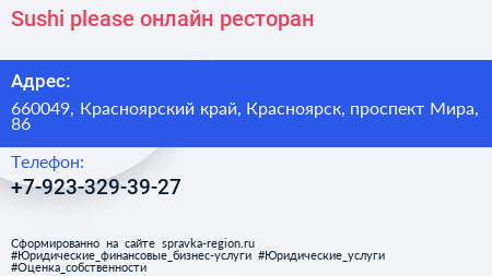 Sushi please, онлайн ресторан по адресу 660049, Красноярский край, Красноярск, проспект Мира, 86 в дальнейшем Организация, размещена в следующих категориях: