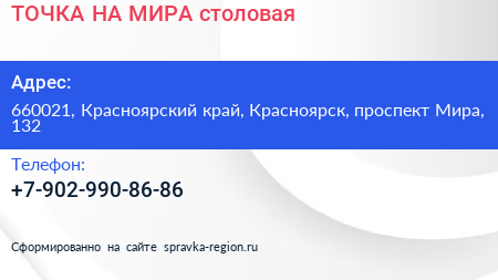 ТОЧКА НА МИРА, столовая по адресу 660021, Красноярский край, Красноярск, проспект Мира, 132 в дальнейшем Организация, размещена в следующих категориях: