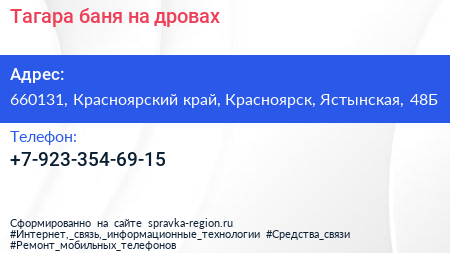 Тагара, баня на дровах по адресу 660131, Красноярский край, Красноярск, Ястынская, 48Б в дальнейшем Организация, размещена в следующих категориях: