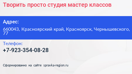 Творить просто, студия мастер-классов по адресу 660043, Красноярский край, Красноярск, Чернышевского, 77 в дальнейшем Организация, размещена в следующих категориях: