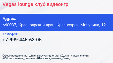 Vegas lounge, клуб видеоигр по адресу 660037, Красноярский край, Красноярск, Мичурина, 12 в дальнейшем Организация, размещена в следующих категориях: