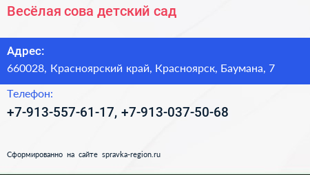 Весёлая сова, детский сад по адресу 660028, Красноярский край, Красноярск, Баумана, 7 в дальнейшем Организация, размещена в следующих категориях: