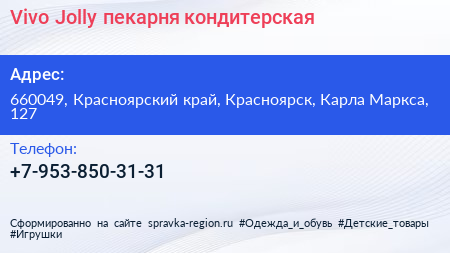 Vivo & Jolly, пекарня-кондитерская по адресу 660049, Красноярский край, Красноярск, Карла Маркса, 127 в дальнейшем Организация, размещена в следующих категориях: