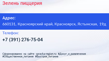 Зелень, пиццерия по адресу 660131, Красноярский край, Красноярск, Ястынская, 19д в дальнейшем Организация, размещена в следующих категориях:
