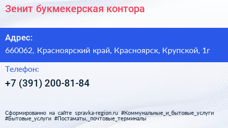 Зенит, букмекерская контора по адресу 660062, Красноярский край, Красноярск, Крупской, 1г в дальнейшем Организация, размещена в следующих категориях:
